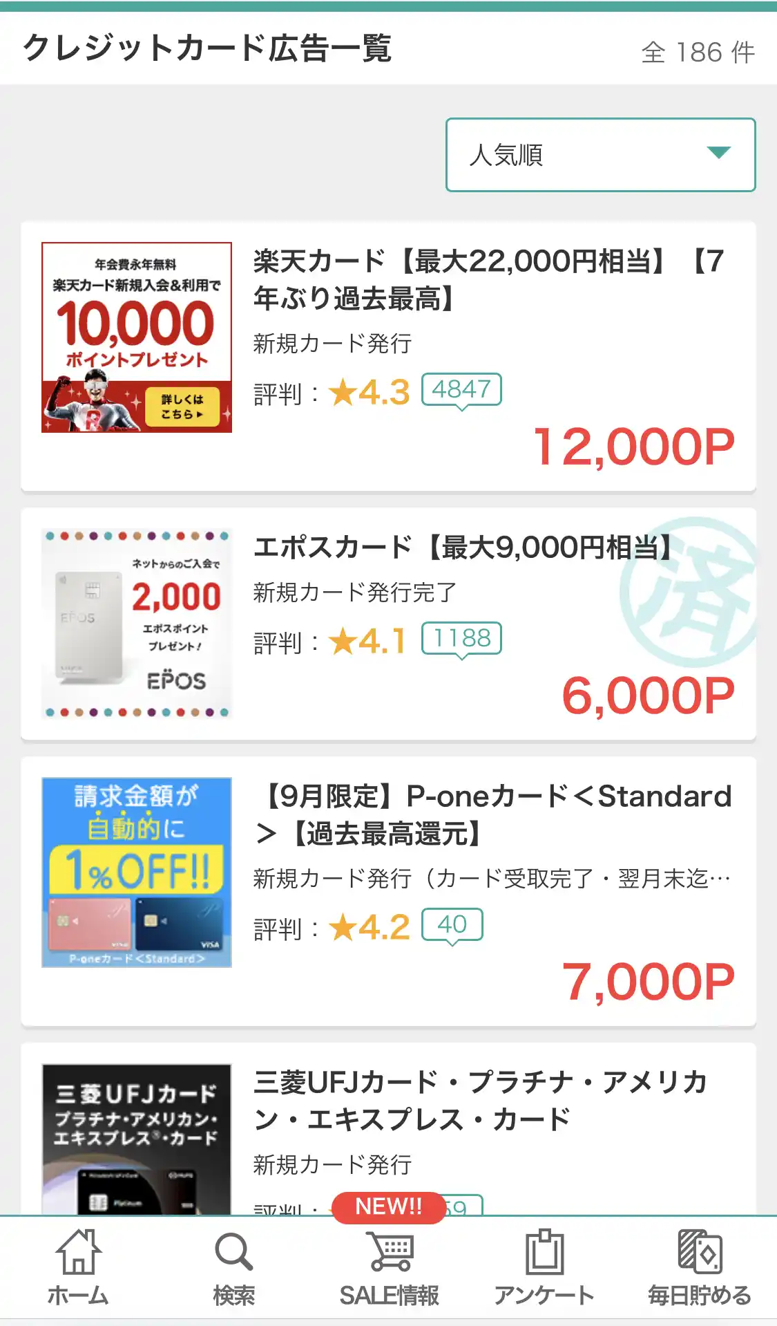クレジットカードの発行については、5,000P(5,000円相当)以上の単価の案件を目安にすると良いと思います。